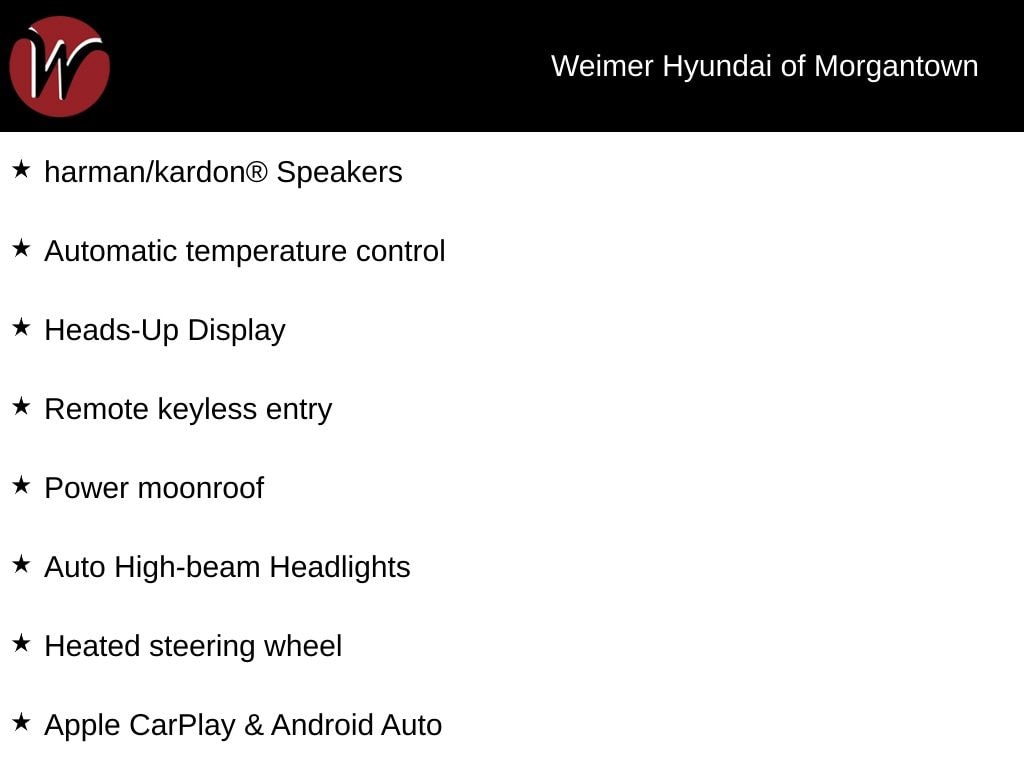 **Weimer Hyundai of Morgantown is your premier destination for both new and Used vehicle's and is proud to be the only non-commission-based dealership in the area. At Weimer Hyundai, we are eager to buy your trade-in! Before you consider selling your vehicle to www.carmax.com or listing it on www.autotrader.com, Cars.com, or www.ebay.com, reach out to our Inventory Manager at (304.658.7800) for a fantastic offer. WE PROMISE TO GIVE YOU $500 MORE THAN ANY Kelly Blue Book Instant Cash OFFER!**