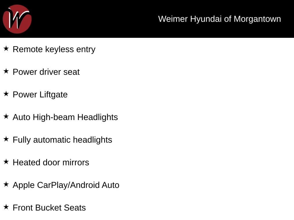 **Weimer Hyundai of Morgantown is your premier destination for both new and Used vehicle's and is proud to be the only non-commission-based dealership in the area. At Weimer Hyundai, we are eager to buy your trade-in! Before you consider selling your vehicle to www.carmax.com or listing it on www.autotrader.com, Cars.com, or www.ebay.com, reach out to our Inventory Manager at (304.658.7800) for a fantastic offer. WE PROMISE TO GIVE YOU $500 MORE THAN ANY Kelly Blue Book Instant Cash OFFER!**